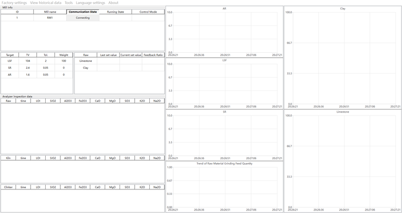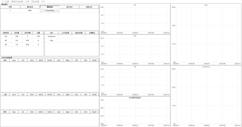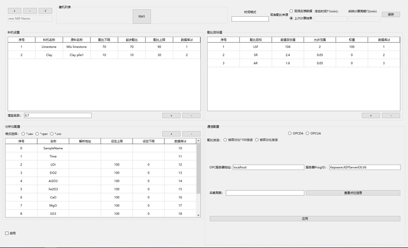 水泥配比软件核心功能包括:1、磨机实时喂料数据采集及手动输入,2、分析仪数据自动读取及解析及手动输入,3最优配比计算,4、历史数据查看,5、磨机配置功能包括:磨机配置,通讯配置,分析解析配置,原料配置,3,多语言贴换