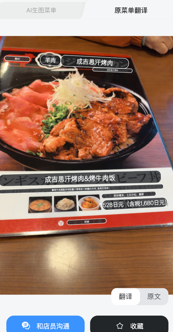 2. 菜单翻译详情:AI识别图片内容后解析出菜品,翻译内容标注在图片上,并且可以对照原菜单查看内容