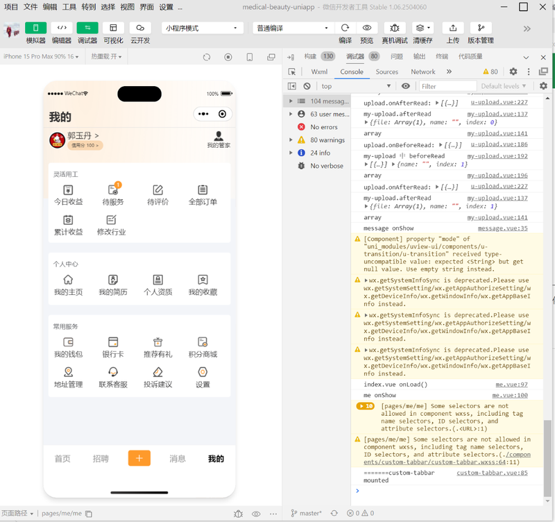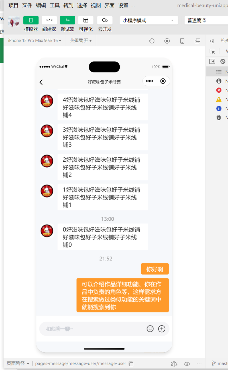 功能模块:个人信息模块:获取 用户微信昵称,头像,手机号码,位置信息;岗位列表和岗位详情。上下班打卡模块:上传带定位地址的图片到后端完成上下班记录。招聘模块:岗位列表,有推荐,最近,最新,选择城市和地区来进行筛选。岗位详情模块:有地图显示定位,在地图上选择地址等。消息模块:消息聊天对话的实现。我的模块:相关周边附加功能。发布模块:可以发布兼职,发布简历,找零工。订单模块。等等。