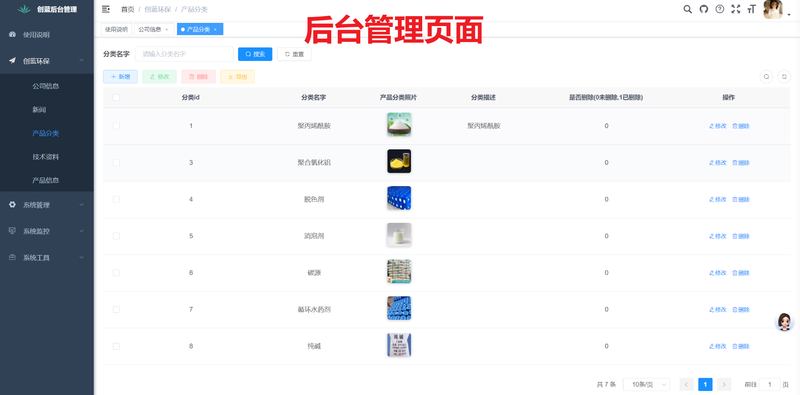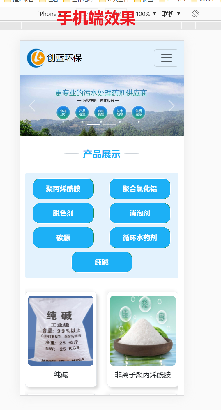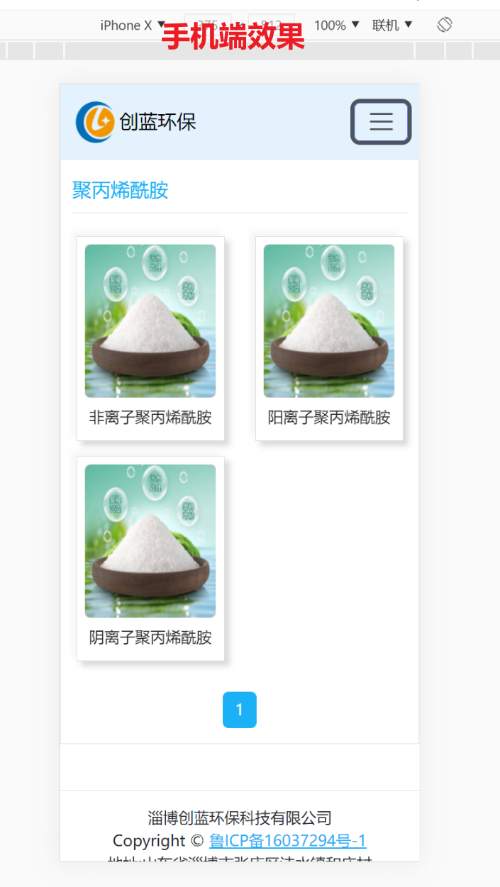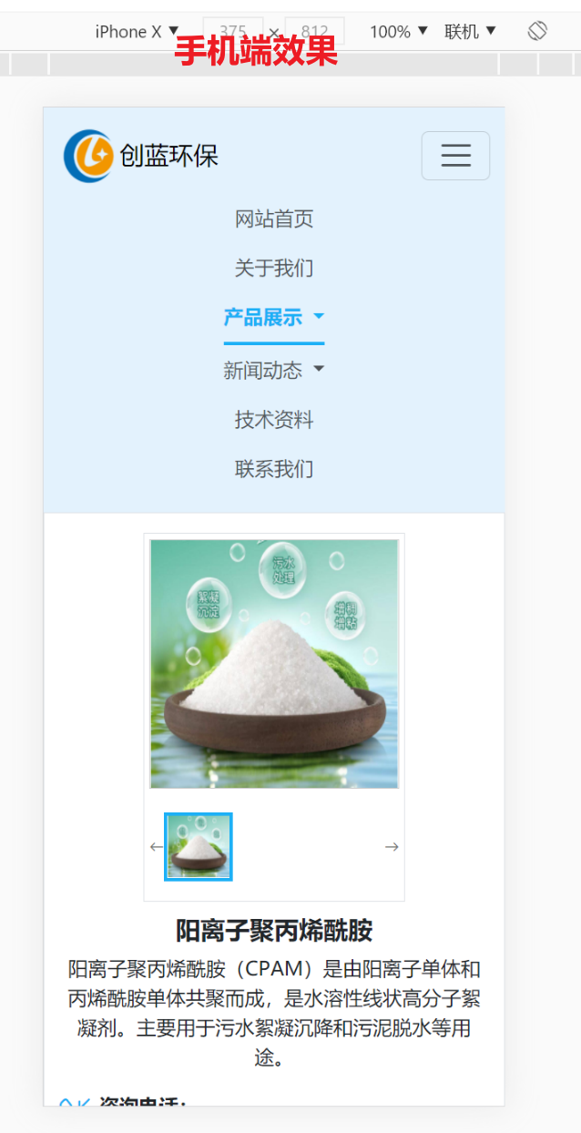 项目名称:创蓝环保企业网站 功能模块:网站首页:轮播图和 各功能界面 入口;产品分类和产品详情;新闻模块:公司新闻和行业新闻;技术资料模块;关于我们。页面在Web端和手机端 都能适配。