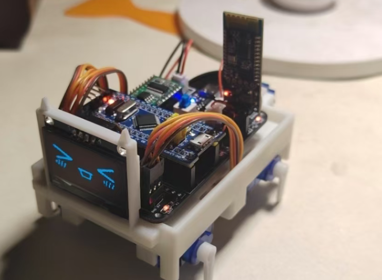 独立设计并实现了一款基于STM32的智能语音交互桌宠系统。系统以语音指令和手机蓝牙遥控作为核心输入,通过OLED屏幕动态表情与多自由度舵机动作,实现生动的拟人化交互。主控STM32负责协调全部功能,通过高效的指令解析与任务调度逻辑,确保表情、动作与用户指令的实时、同步响应。