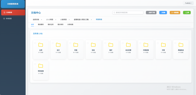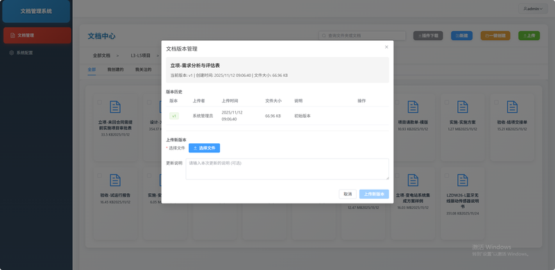 文档上传模块:上传文档支持所有格式的文件,以及压缩包,上传后可进行文档版本管理。