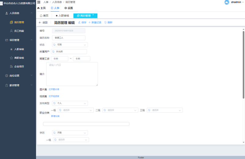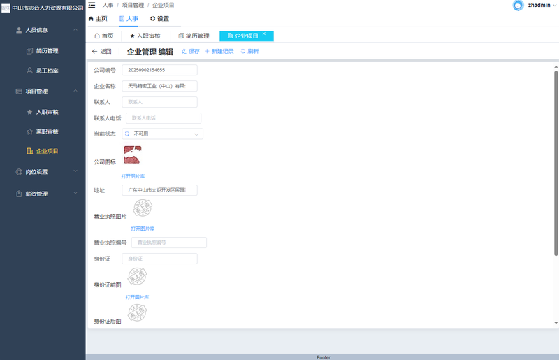 人力系统所有资料数据管理(包括 企业资料、图片、岗位信息、人员信息等),设计系统录入企业信息、绑定岗位信息、设置驻
