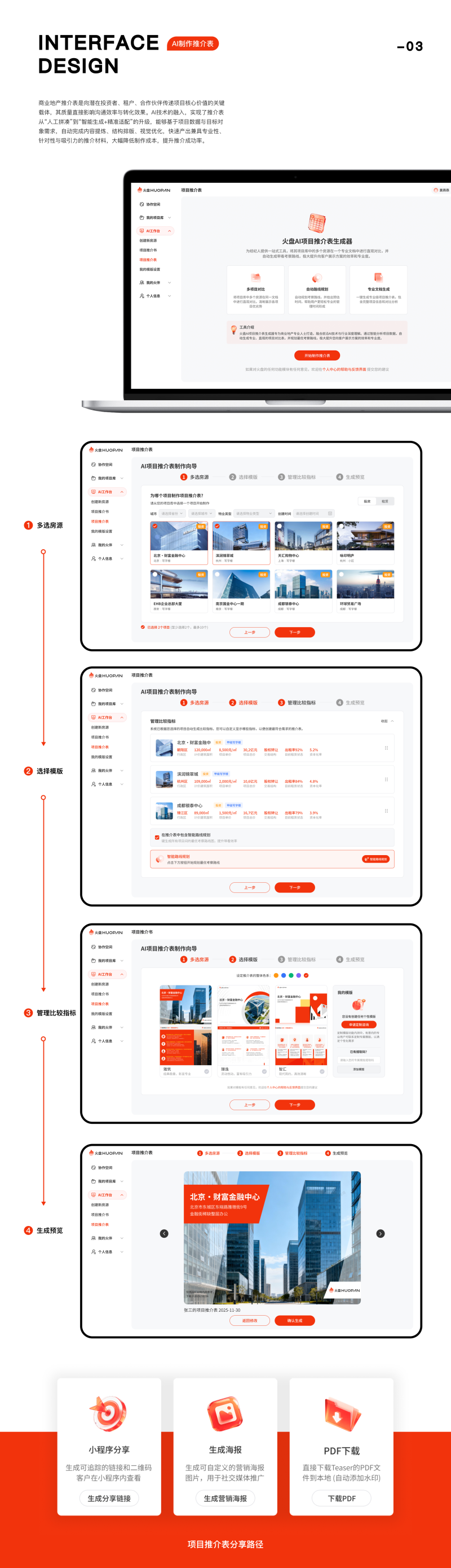 3.AI工作台-AI制作推介书、AI制作推介表、AI创建新房源、我的模版设置-作为AI商业房地产平台的"智慧大脑”,智能分析功能连接数据采集层与决策应用层,既实现数据的深度挖掘,又通过可视化交互界面将分析结果高效输出,满足不同角色(投资者、开发商、招商团队、企业选址负责人)的专业化分析需求。替代传统”经验判断"模式,以数据算法量化分析项目潜力与风险,提升决策准确性。
