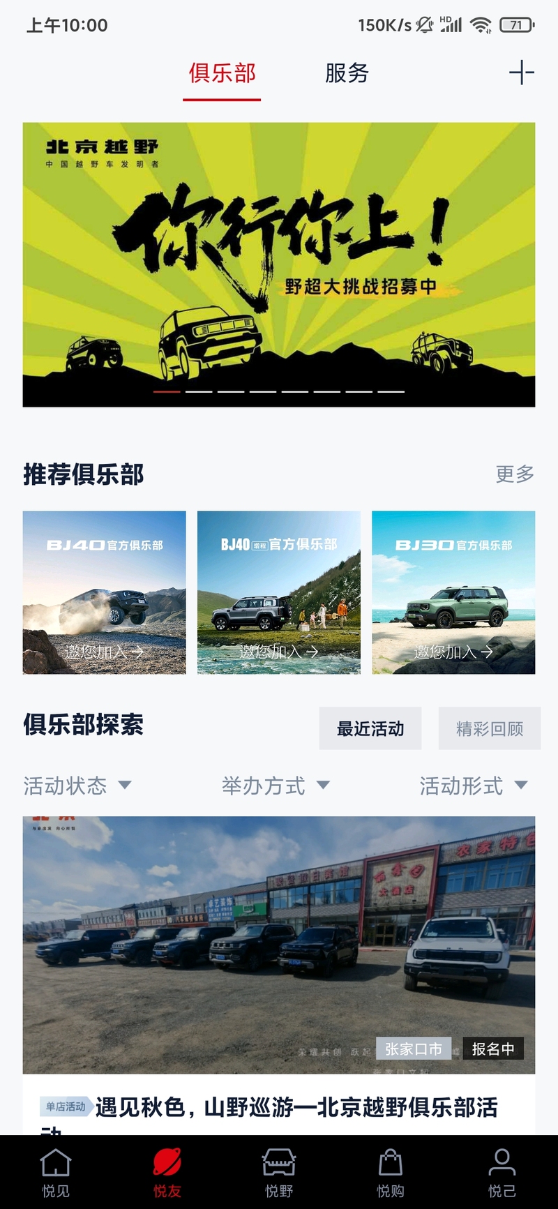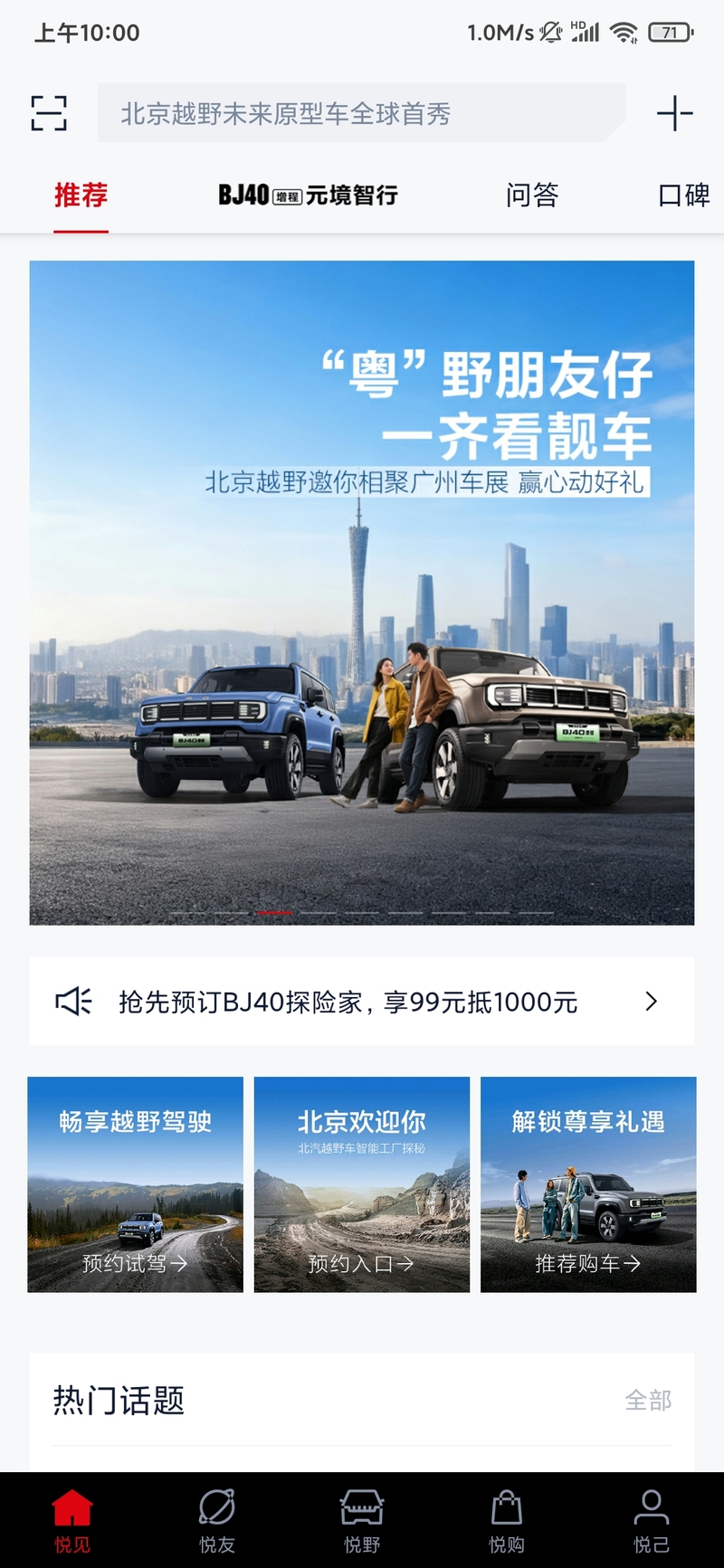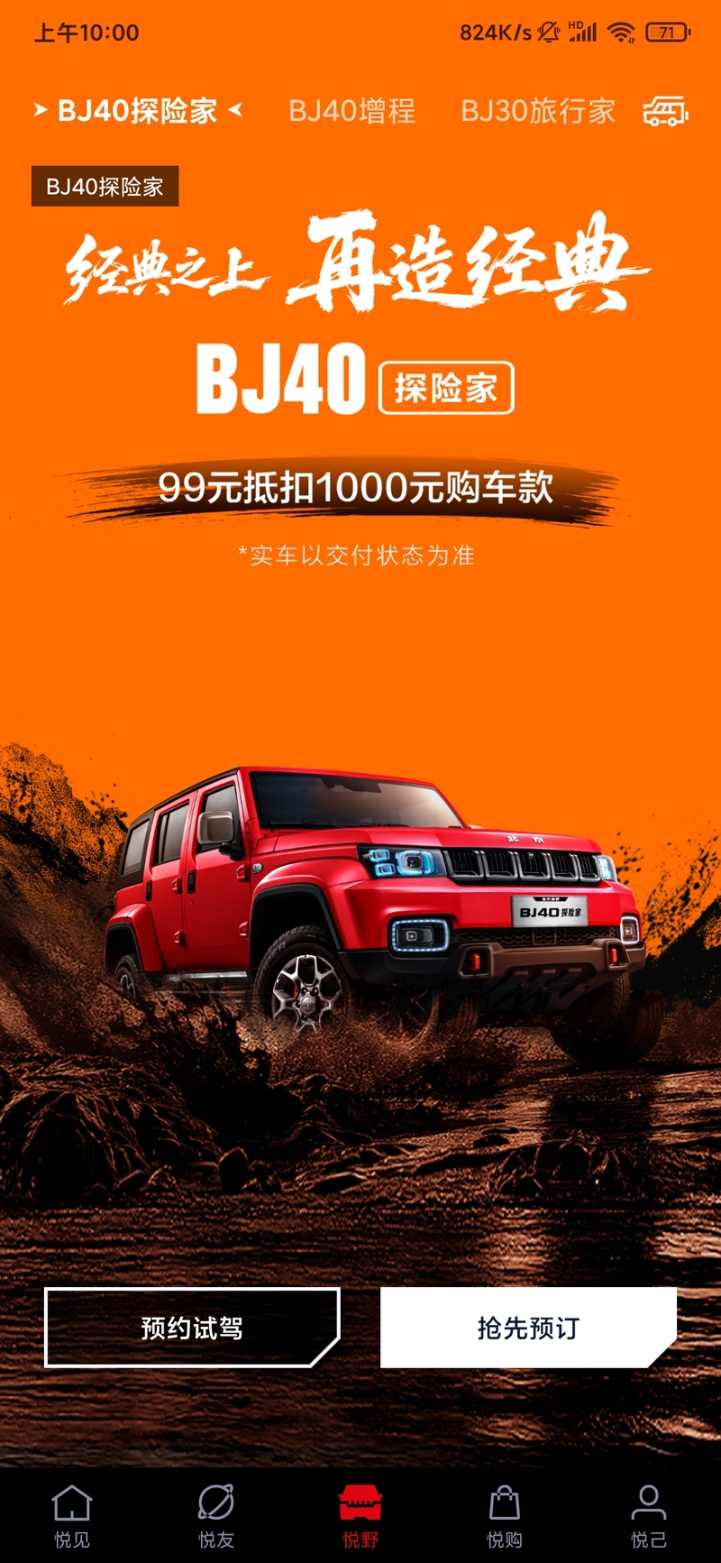悦野圈是一款北京汽车集团越野车有限公司旗下的车联网 APP 。近年来,北汽越野车公司肩扛“越野世家”大旗,致力于自主品牌越野车的研发和生产制造,取得了一系列新发展成绩,BJ80和 BJ40系列产品深受消费者的青睐。