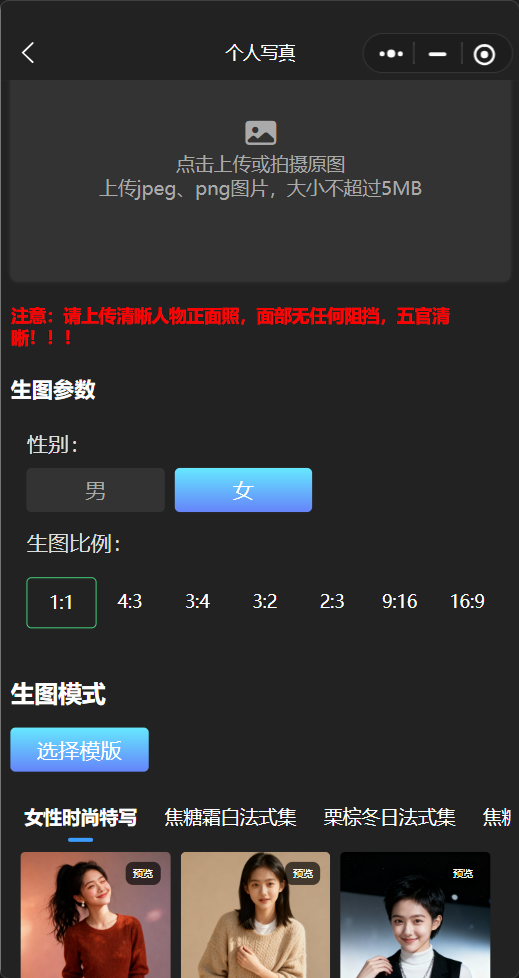 2、主要功能具体介绍:用户在创建写真的时候上传自己的正面照,选择生图比例,选择喜欢的写真模板然后提交等待10秒即可生成写真;