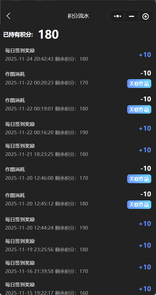 3、辅助功能具体介绍:生成写真后可以下载预览,每次生图所用积分均可到积分流水中查看,奖励中心中可以查看自己获得的奖励比如:每日签到奖励、分享拉好友、视频号/公众号文章进入获取奖励;