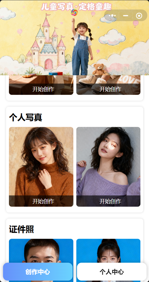 1、主要功能模块:儿童写真、个人写真、证件照,辅助功能模块:奖励中心、我的作品、会员中心、积分流水、客服;