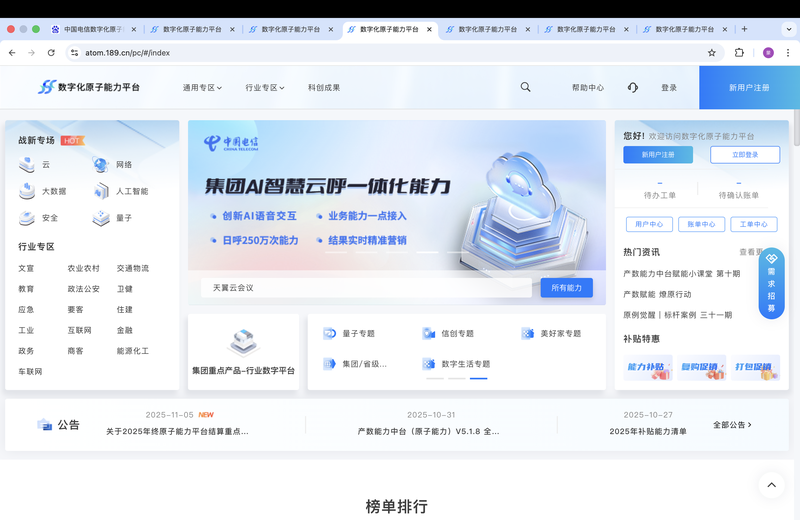 中国电信数字化原子能力开放平台是提供围绕通信、大数据、AI 、视频、智能连接、物联网、安全等软件应用及服务,类似阿里云市场。使用微服务架构,分为商品模块,订单模块,用户模块,运营模块等。