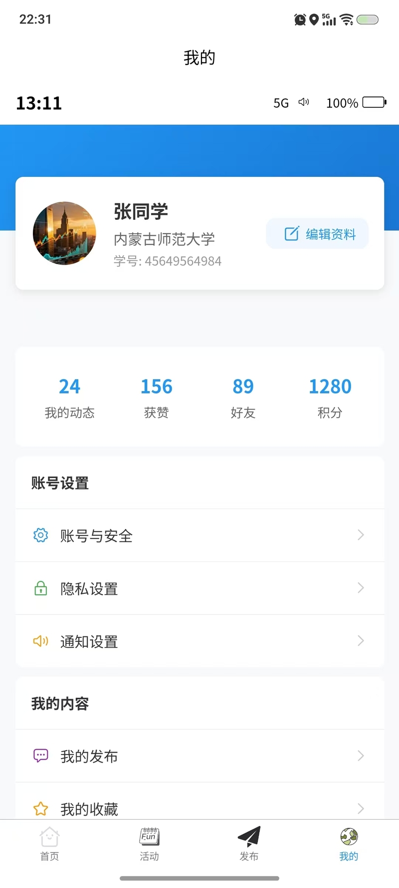 个人信息管理:显示学号、学校等身份信息,支持编辑资料,可查看动态、获赞、好友、积分等数据。