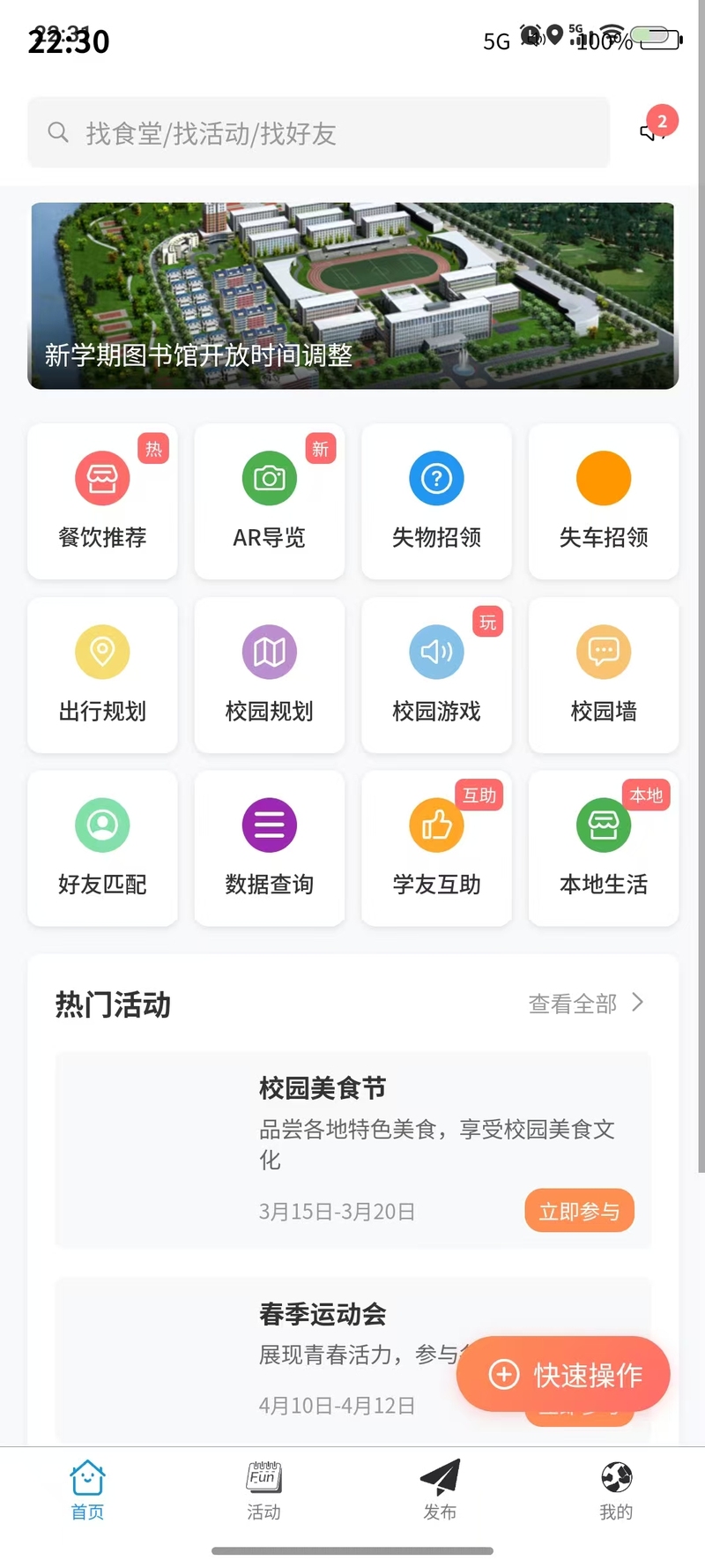 热门活动板块:实时展示校园活动(如美食节、运动会),可直接点击参与,方便获取校园资讯。