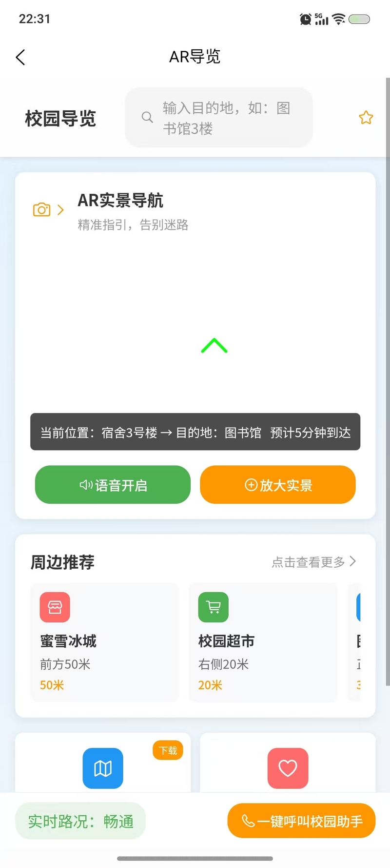 实景导航:支持输入目的地(如图书馆),基于 AR 技术实现精准实景指引,显示实时位置、预计到达时间,还能开启语音导航、放大实景。