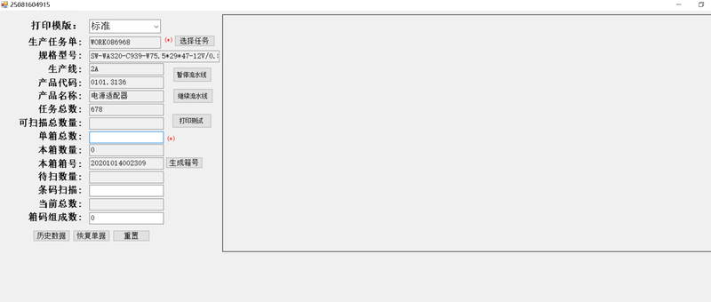 5.流水线协同控制与自动打印: 触发挡杆的同时,系统会自动暂停流水线,以便进行换箱操作。系统自动生成该箱的外箱标签,内容包含但不限于:箱号、产品数量、起始与结束序列号、生产日期/时间等,并指令标签打印机立即打印。