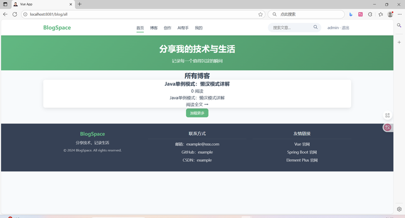主要功能描述:支持用户注册账号并登录系统,通过富文本编辑器发布和管理博客文章,可按分类筛选或搜索文章;集成 AI 能力,用户可向 AI 助手提问,系统基于现有博客内容生成相关回答;采用响应式设计,适配电脑、平板等不同设备,提供流畅的浏览和操作体验。