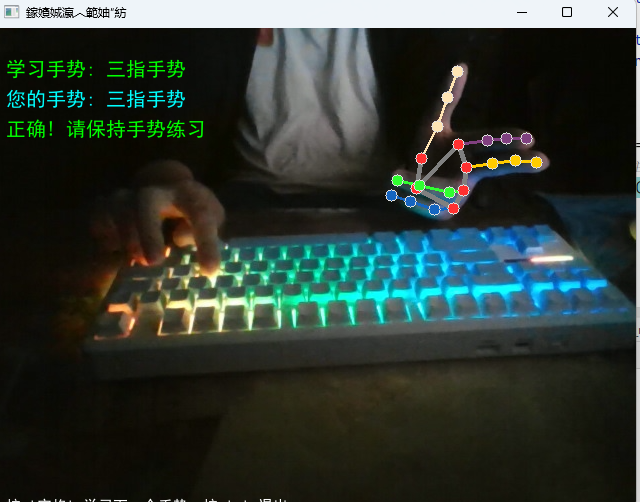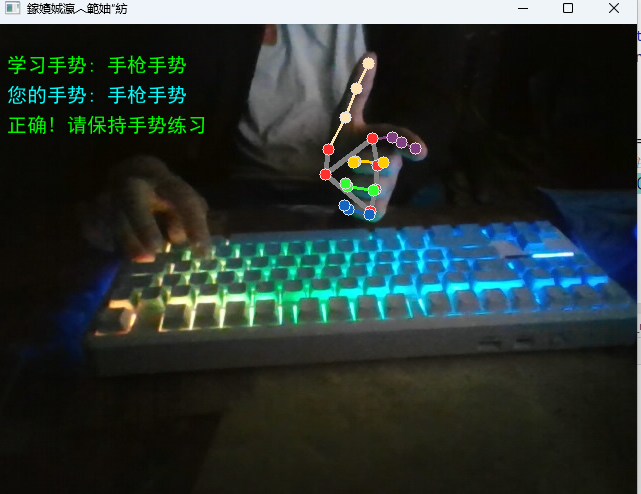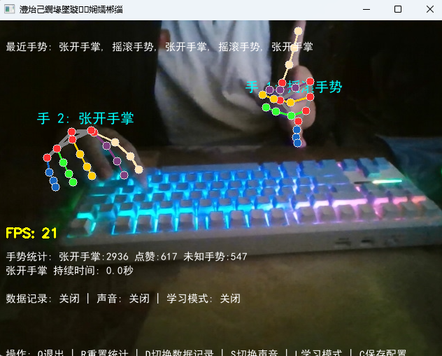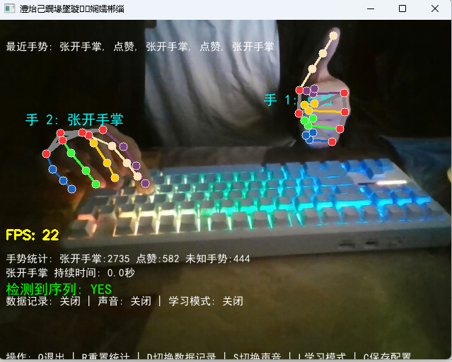 1、我负责了整个系统的架构设计和核心算法开发,包括手部关键点检测算法的优化、手势识别逻辑的实现、用户交互界面的设计、数据记录与分析模块的开发、声音反馈系统的集成以及系统配置管理。特别针对中文显示和手势识别准确率进行了深度优化。