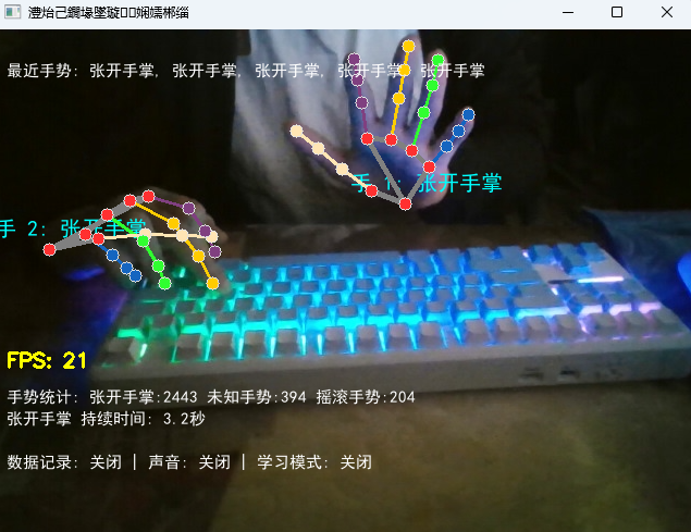 系统能够实时检测并识别包括字母A-Z、数字手势、常用表达手势在内的多种手语手势,采用双算法融合(角度检测+距离检测)提高识别准确率。支持双手同时检测,提供中文界面显示,具备手势持续时间统计、使用频率分析功能。学习模式逐步引导用户掌握正确手势,声音反馈增强用户体验。系统还支持手势数据导出,便于后续分析和模型优化。