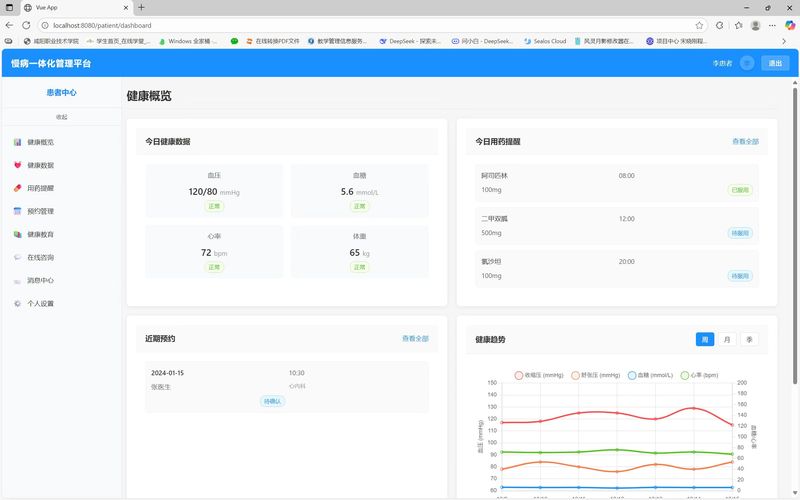 慢病一体化管理平是基于Vue 3、Vuex、Vue Router构建的医疗健康管理系统。该平台为医生、患者和管理员提供全面的慢病管理解决方案,采用前后端分离架构,前端使用Chart.js实现数据可视化,Axios处理HTTP请求。