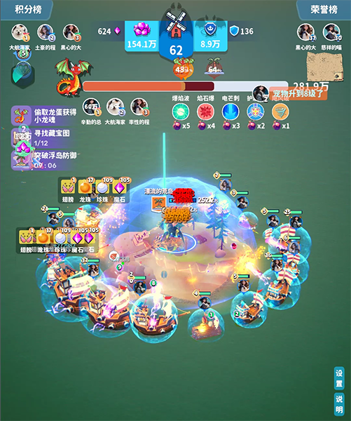 块固定岛屿和隐藏的浮岛组成鼠标点击岛屿可切换视角,双击地面可调整观看角度。玩家可通过去口令去+标注的数值字母去狩猎或捕鱼,主播点击角色可开启玩家视角。岛屿等级 主播岛屿加入资源等级和防御属性,魔石是岛屿的主要财富象征,主播通过日常收集和夺取获得,岛屿等级等于所有玩家平均等级,岛屿的防御随直播时长不断增加。玩家越多增加速度越快。玩家等级,玩家通过抓鱼或狩猎收集升级材料,武器宠物和船需要升级或强化时会有角标提示,玩家可以通过输入口令实时查看属性界面,通过口令升级+物品名称升级的物品,通过口令强化+物品名称强化物品,物品升级和强化需要各种特殊材料,材料具体用途可参考右下角说明界面。主播可鼠标点击玩家属性界面辅助玩家升级和强化物品。玩家也可通过礼物开启托管功能自动升级,托管模式下玩家需要关注物品的强化,物品强化不能托管,升级到顶级的物品玩家通过口令或礼物进行强化后才可以继续升级,口令强化有一定概率会失败通过礼物可一次强化成功。宠物系统 宠物可为玩家提供体力和防御 玩家需要从龙岛偷取龙蛋也可击败小龙获取龙蛋驯化为宠物,肉是宠物蛋的日常消耗品,需要定时喂养升级。宠物蛋强化到5阶龙蛋后可突破为宠物龙仔。战斗系统,战斗分打野怪和抢夺两部分,野怪分4个等级主岛有野兔绵羊属于低级怪时候新手打怪练级,左侧野猪岛和鳄鱼岛属于高级野怪适合高等级玩家练级,小龙,大龙会定时刷新,需要主播发起挑战一起攻打,挑战成功后获得龙魂可防御岛屿被掠夺。抢夺模式,主播可通过雷达扫描隐藏的其他主播岛屿和漂浮的荒岛,找到浮岛后主播看发起抢夺任务夺取浮岛资源。抢宝箱,集齐藏宝图后宝箱就会掉落到固定海域,玩家输入抓宝口令参与抢宝箱活动。