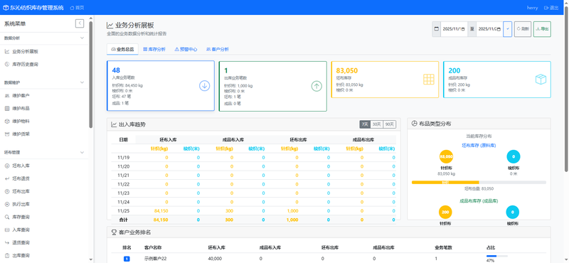 查询统计模块:提供多维度组合查询、库存异动分析和成布率自动计算功能,满足不同层面的数据分析需求。