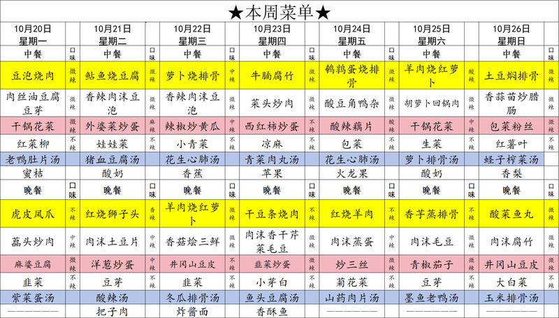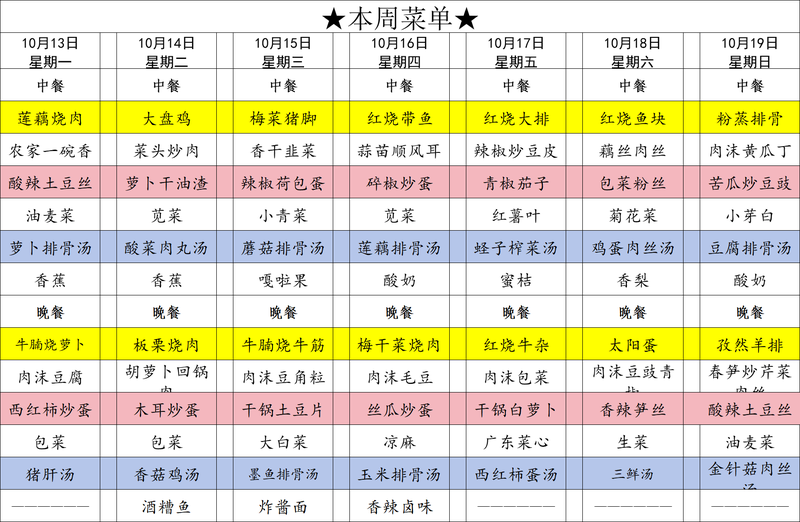 1、每月需要制定菜单,有猪肉类、牛羊肉类、鱼类、主花荤、花荤、汤、时蔬等大类。需要将每个大类的百余菜品按指定需要生成:每天必须有猪肉类,搭配其他肉类+花荤+汤等,且不能连续两天做法类似,例如今天是红烧肉,明天红烧排骨,
