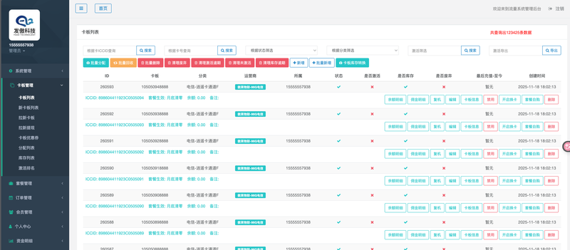 核心卡管理模块:支持物联卡的批量导入、单个激活、暂停和销户。提供实时查询卡片在线状态、已用流量、剩余流量和生命周期状态(如:正常、停机、已销户)。