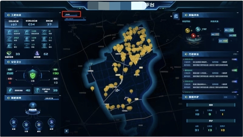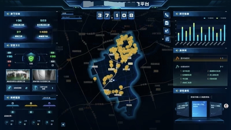 展示该区人防工程数量,某一个工程在地图上的位置,这个工程的部件;每个街道防空警报器的数量;探测器数量;街道指挥所的名称和在地图上的位置;已完成的演练详情描述;某一个人防工程的基本信息,安全检查情况,探测器数量,使用备案,风险评估,维修养护记录,工程视频/VR展示。