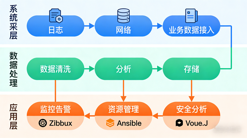 主要功能:通过 Filebeat 采集多来源日志(系统、应用、网络),经 Logstash 过滤格式化后存储至 Elasticsearch;配置日志轮转 + 对象存储归档策略,降低存储成本;通过 Kibana 配置关键字告警(如 “Error”“非法访问”);支持按时间 / 级别 / 关键字快速检索日志,生成可视化分析面板。