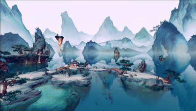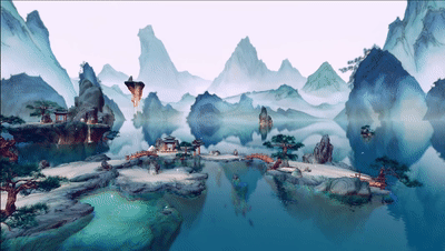 远景的山峦采用动态的晕染与飞白效果,近景的树木、岩石保有干湿浓淡的笔触感,随玩家视角移动产生微妙的层次变化。