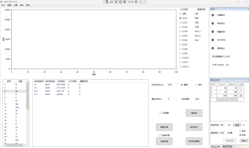 采用C语言开发了下位机系统控制软件,采用C#语言开发了Windows应用界面,实现的发射光谱的测量分析功能。控制激发源激发元素的发射光谱,通过CCD采集信号,完成数据处理分析,得到最终测量结果。