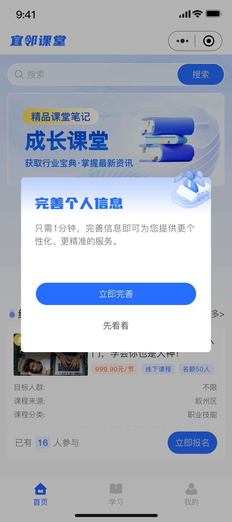 平台的内容中枢。市级统一制定课程分类标准,涵盖公民素养、职业技能、文化传承、健康生活、科学普及等系列,确保全市课程体系规范统一。支持社区按需申报课程,经区县审核上线。课程支持多课时灵活设置,学员可自由选择单节或多节课时报名;支持线上、线下授课模式;支持免费或低偿收费策略,并具备独立的报名人数下限判定与开课逻辑。同时,平台内置“心愿课程”功能,收集群众个性化学习需求,对优质课程给予积分奖励并纳入全市共享库。