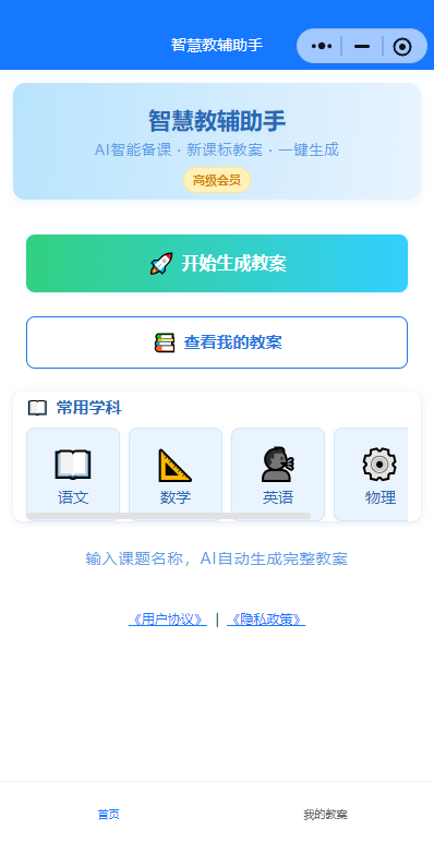 架构:app.json 定义主包页面(首页/教案列表/登录/协议/隐私)+ 分包 main(生成/会员/反馈)与 detail(详情),预加载规则加速核心路径;app.js 负责全局状态、启动检查登录、系统配置拉取、登录路由守卫;utils/api.js 统一请求、状态码/业务码处理、401 自动清 token+跳转登录、友好错误提取、上传封装。