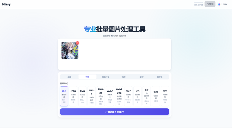 2. 前端图片处理引擎:基于 HTML5 Canvas API 实现客户端图片处理,支持三种处理模式(compress压缩/convert转换/resize调整)。压缩质量可调50%-100%,支持JPG/PNG/WebP/BMP/ICO等多种格式互转,尺寸调整支持自定义宽高并可保持比例。使用 canvas.toBlob() 实现高质量图片导出,支持批量处理和进度显示。