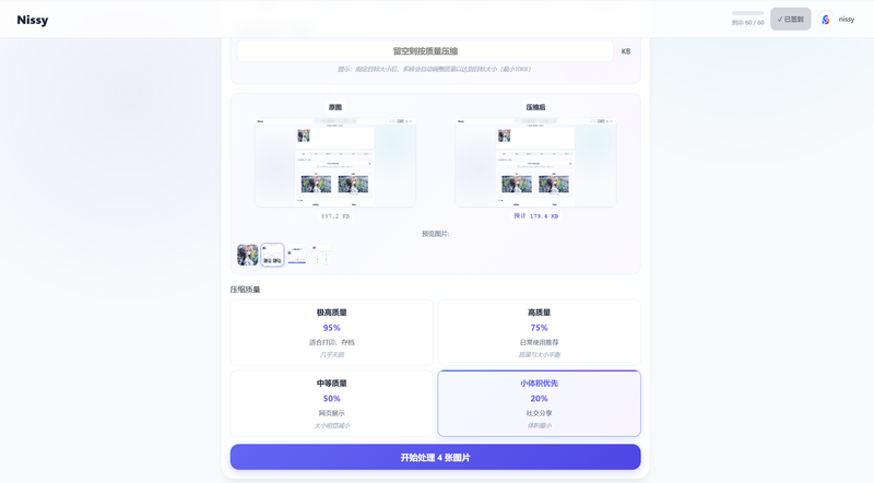 开发了一款基于 Web 的图片批量处理工具,,为用户提供前端本地图片压缩、格式转换和尺寸调整等服务。项目采用前后端分离架构,实现完整的用户认证体系、配额管理系统和任务追踪功能。使用 HTML5 Canvas API 实现客户端图片处理,无需上传服务器即可完成处理,保护用户隐私。