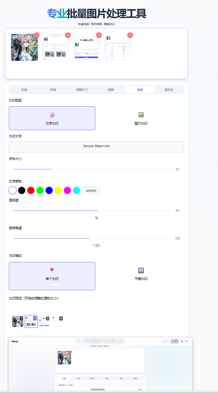 3. 高级图片编辑功能:实现图片裁剪功能(可拖动裁剪框、实时预览)、水印添加功能(支持文字/图片水印、透明度调节、位置拖动、平铺模式)。所有处理均在浏览器本地完成,无需上传服务器,保护用户隐私。