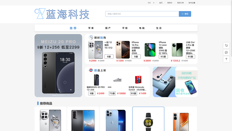 本项目为蓝海商城项目,采用Vue3、Element-Plus、axios、sass等技术栈,本项目将采用前台通过UserAgent请求头信息来识别手机端和pc端的路由切换,进行不同端页面的展示,前台目前只完成了pc端的制作,手机端待开发,后台采用的是媒体查询以及视口宽度单位进行响应式页面适配。