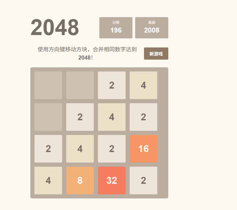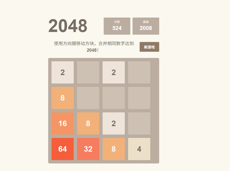 - **经典玩法**:原汁原味的 2048 游戏体验 - **分数追踪**:实时分数计算 - **最高分记录**:使用 localStorage 持久化存储最高分 - **游戏状态**:胜利/失败检测 - **响应式设计**:适用于各种屏幕尺寸 - **键盘控制**:方向键控制方块移动 - **现代界面**:简洁直观的用户界面