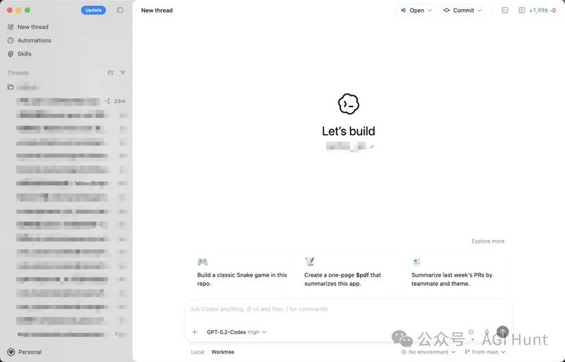 中间是对话和工作区,底部可以切换 Local 和 Worktree 两种模式,还能选模型(默认是 GPT-5.2-Codex High)和执行环境。