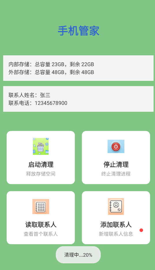 核心功能模块包括:垃圾清理:扫描并清理缓存、残留文件,通过异步任务实现后台执行与清理进度实时可视化;联系人管理:读取并展示本地联系人信息,支持新增与查询;权限适配:针对Android 13+存储权限进行特殊处理,修复权限弹窗无响应问题;交互优化:提供任务中断、操作反馈等功能,提升应用稳定性与用户体验。