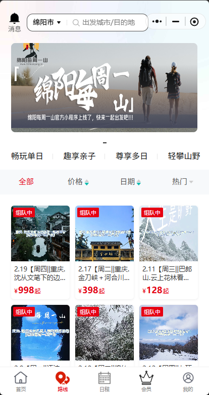 旅游线路管理:支持线路发布、编辑、上下架,多日期价格与成团人数设置,多集合点差异化定价,前N名优惠及会员折扣等营销策略。