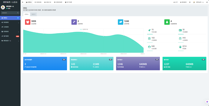 后台管理:资金流水、提现、对账等财务管理;订单状态、支付、退款等消息推送;订单、出行人、财务等数据自定义导出;基础配置、权限管理、操作日志、本地及OSS文件存储配置。