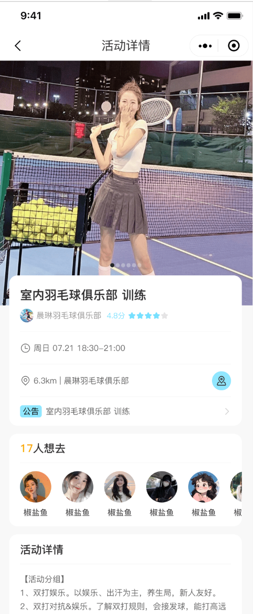 报名活动或收藏 “想去”,管理报名;查看集合地点并导航,活动当天可共享位置;加入活动临时群组或长期兴趣群组进行互动;关注俱乐部,与粉丝互动并发布动态;邀请好友获奖励,组队报名享优惠;通过个人中心管理信息、活动、群组等,接收各类消息通知。
