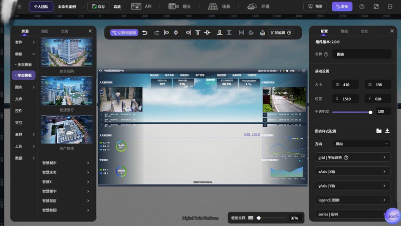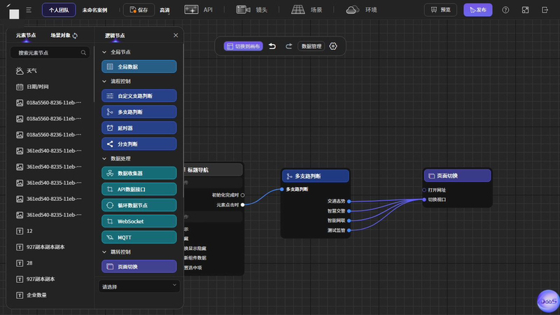 拖拉拽搭建业务面板,支持全部echarts,预设各类常用组件,文字、图表,天气,下拉框,导航,自定义图片,SVG,颜色选择器等,支持动、静态数据接入,第三方系统接入,可视化接入业务数据,连线串联组件,搭建整页关系网,自带30+各行业模版,一键生成POC展板