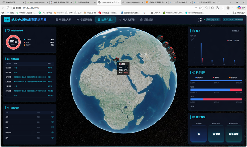 用react语言 实现大屏幕UI,包括无人机和割草机的数据概览,可以看到 所有设备的具体位置和运行情况,识别障碍物弹窗,还可以看到 设备的运行视频,进行远程遥控和地图上显示无人机预设的航线轨迹和机器实时运行的轨迹。