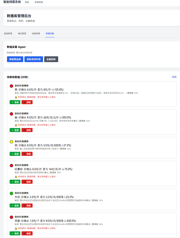 5、智能菜价更新:内置专用Agent自动抓取近期市场菜价数据,实时更新食材成本信息,确保排菜方案的成本估算贴合实际行情