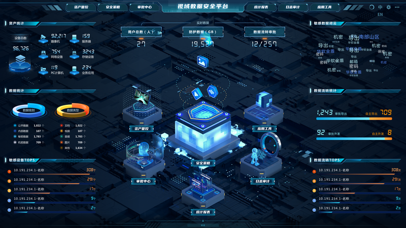 单独对资产设备进行数据安全的整体把控,并通过数据分析生成对应报告与日志等,具体分为首页大屏,资产管理、安全策略、审批、报告、日志等。具体内容涉密级别无法展示与详细介绍,仅展示效果图。