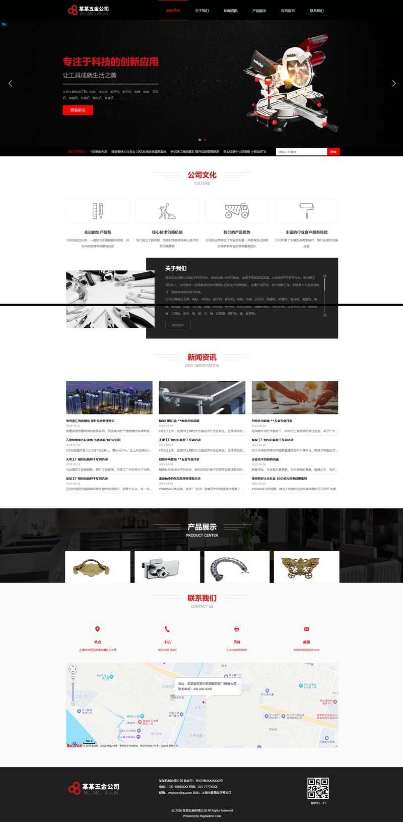 网站包含首页轮播广告位、公司文化介绍、关于我们、新闻资讯、产品中心、联系我们等模块。首页通过大幅轮播图和文案展示品牌定位和主打产品;产品中心按分类展示多种五金产品,支持查看图文详情;新闻资讯用于发布企业动态与行业信息;底部提供公司地址、电话、邮箱、二维码等联系方式,方便客户多渠道与企业取得联系,整体提升品牌形象和线上营销能力。