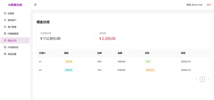 自动化佣金计算(支持不同层级不同比例)。