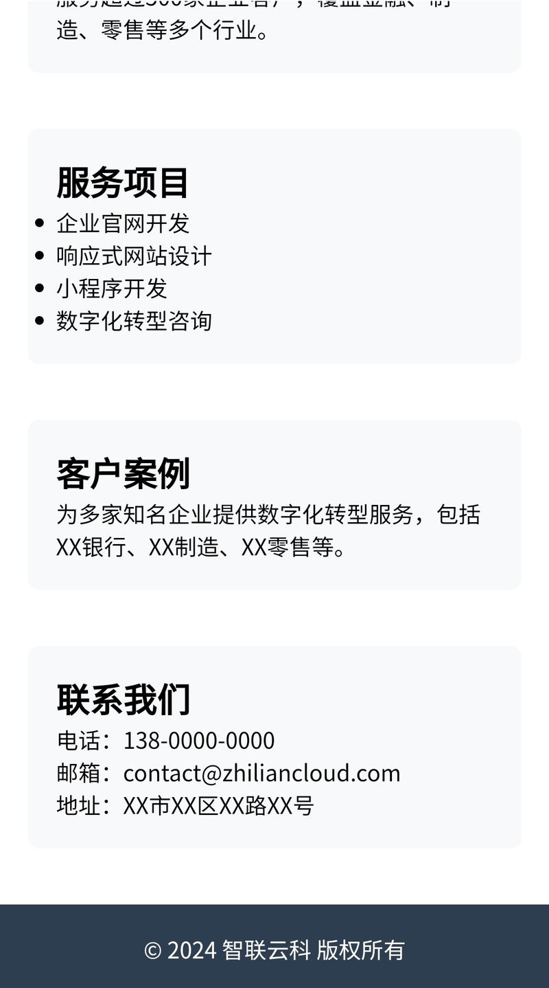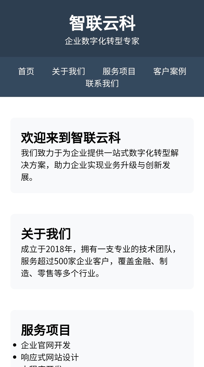 3. 服务项目:详细展示企业提供的数字化转型解决方案,包括云计算服务、企业官网开发、小程序开发等。