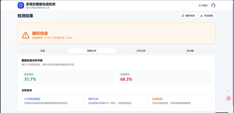 - 图像伪造检测模块:CLIP视觉特征分析、噪声分析网络、边缘检测网络、注意力热力图定位