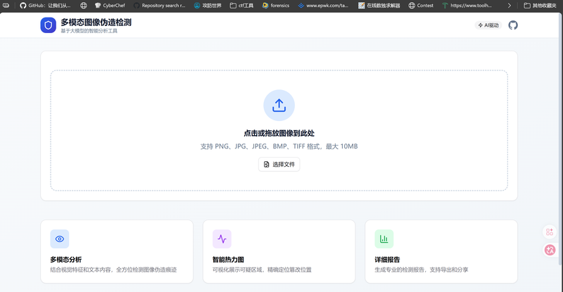 支持单图/批量图像伪造检测,自动提取并分析图像中的文本内容,生成注意力热力图精确定位可疑篡改区域,提供伪造概率评分和置信度判定,输出包含各项指标的专业检测报告,支持报告导出和分享。